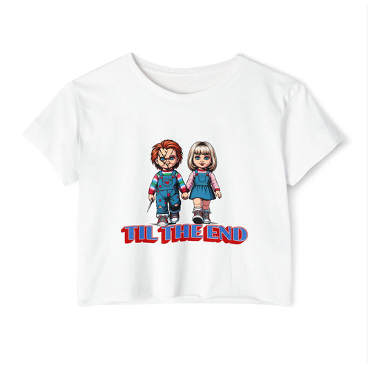 Chucky & Tiffany Festival Crop Top - Til The End Graphic Tee for WomenVendor:PrintifyRegular price $15.99 USDRegular priceUnit price / per