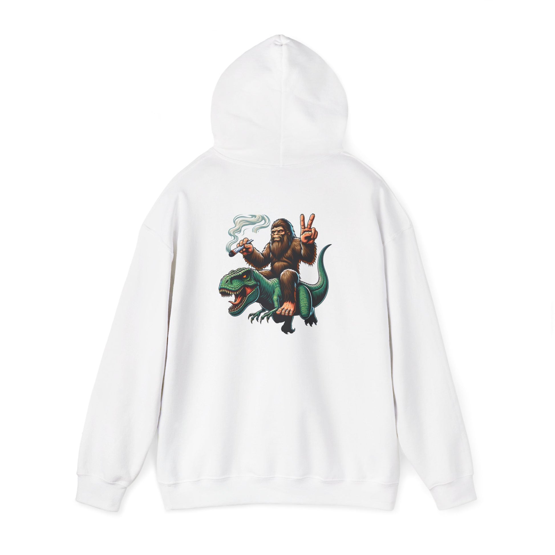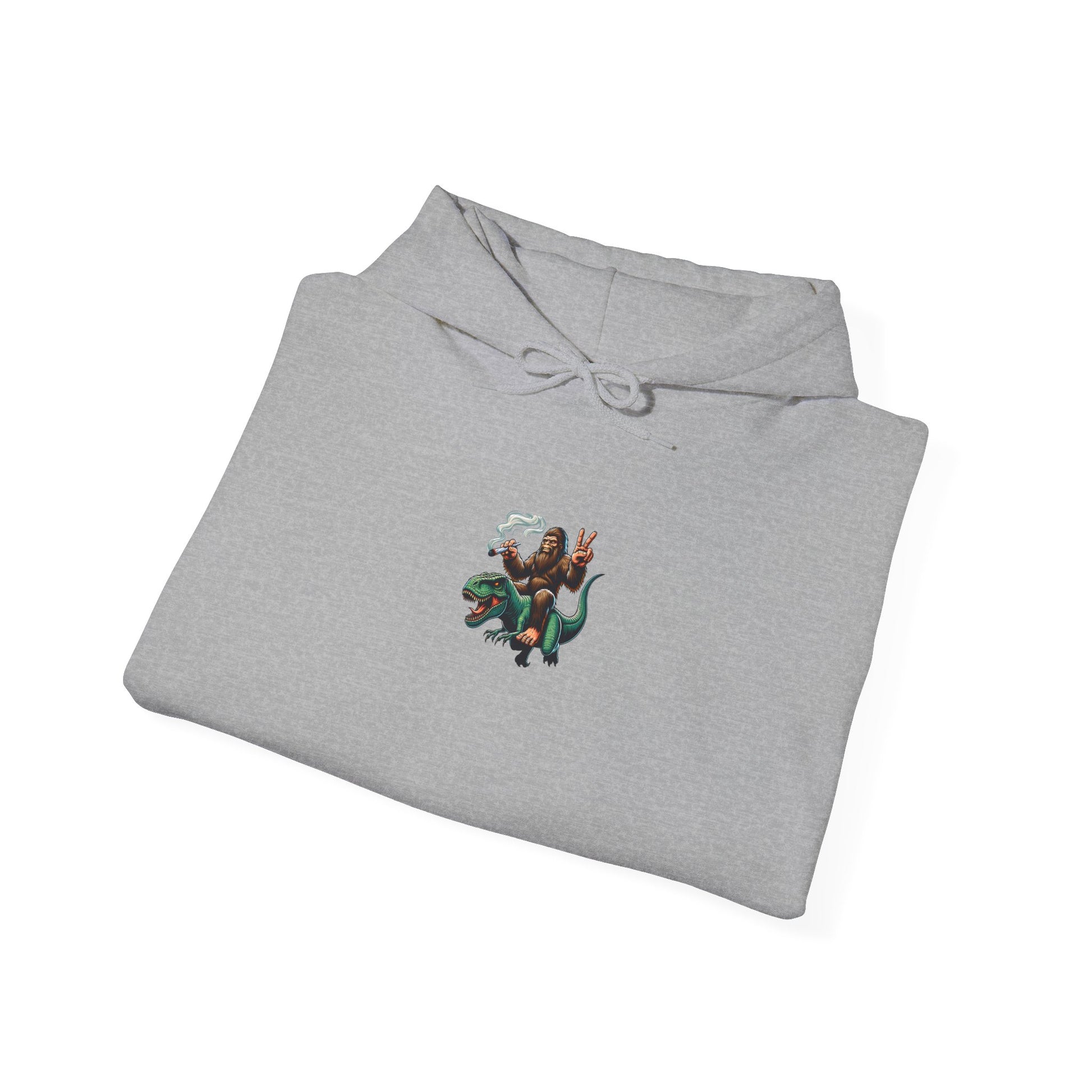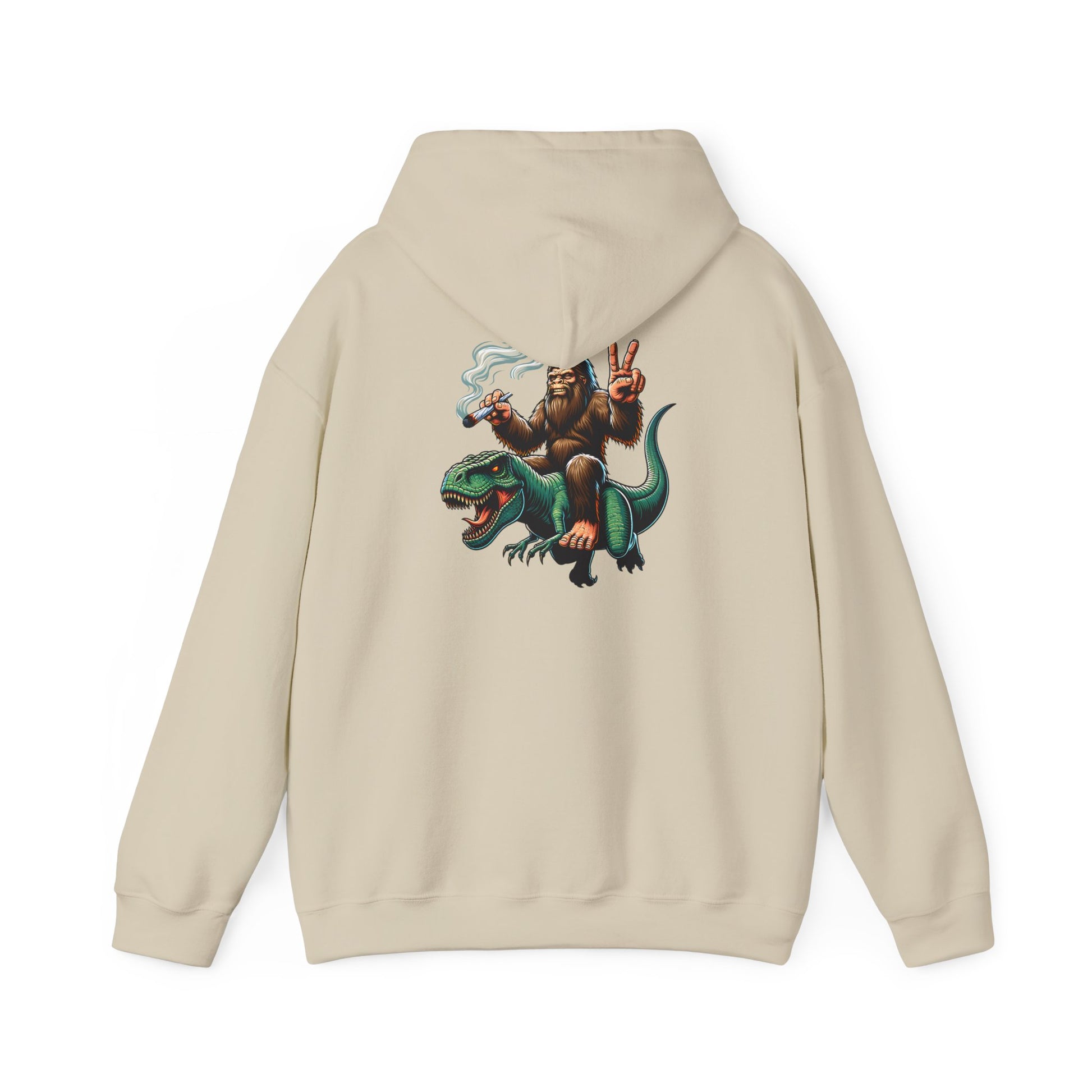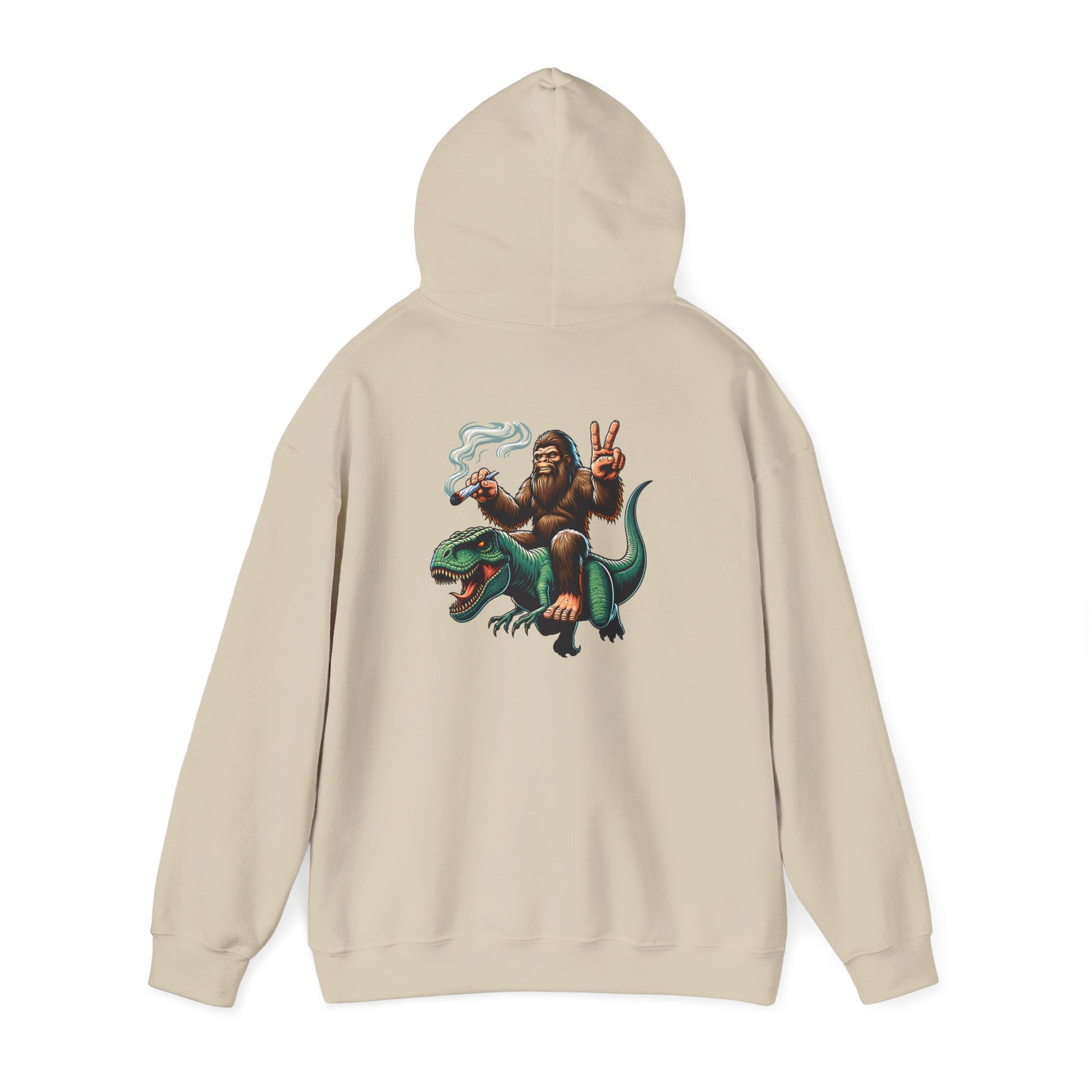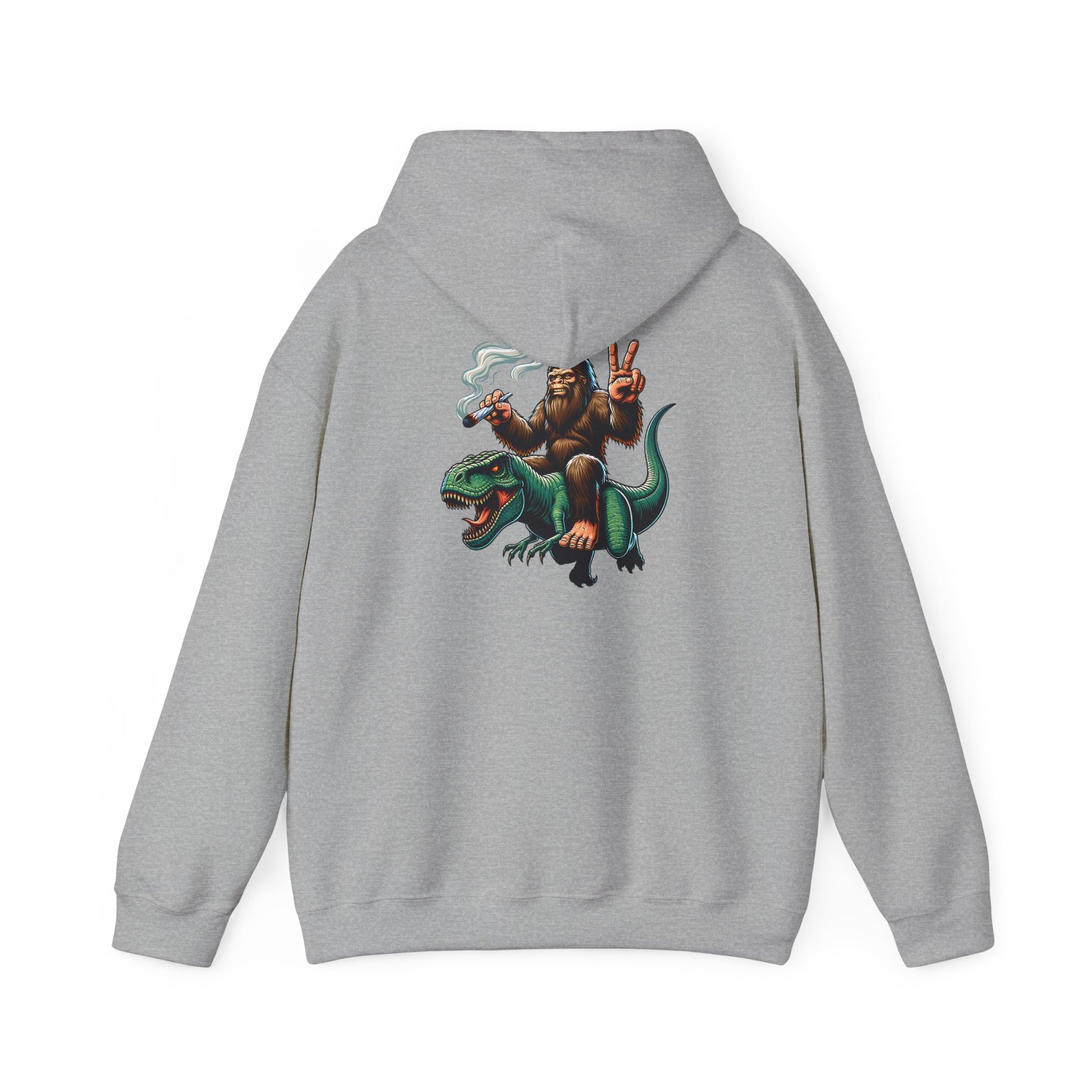 Bigfoot Riding Dinosaur Hoodie — Retro Smoking Sasquatch Graphic Sweatshirt