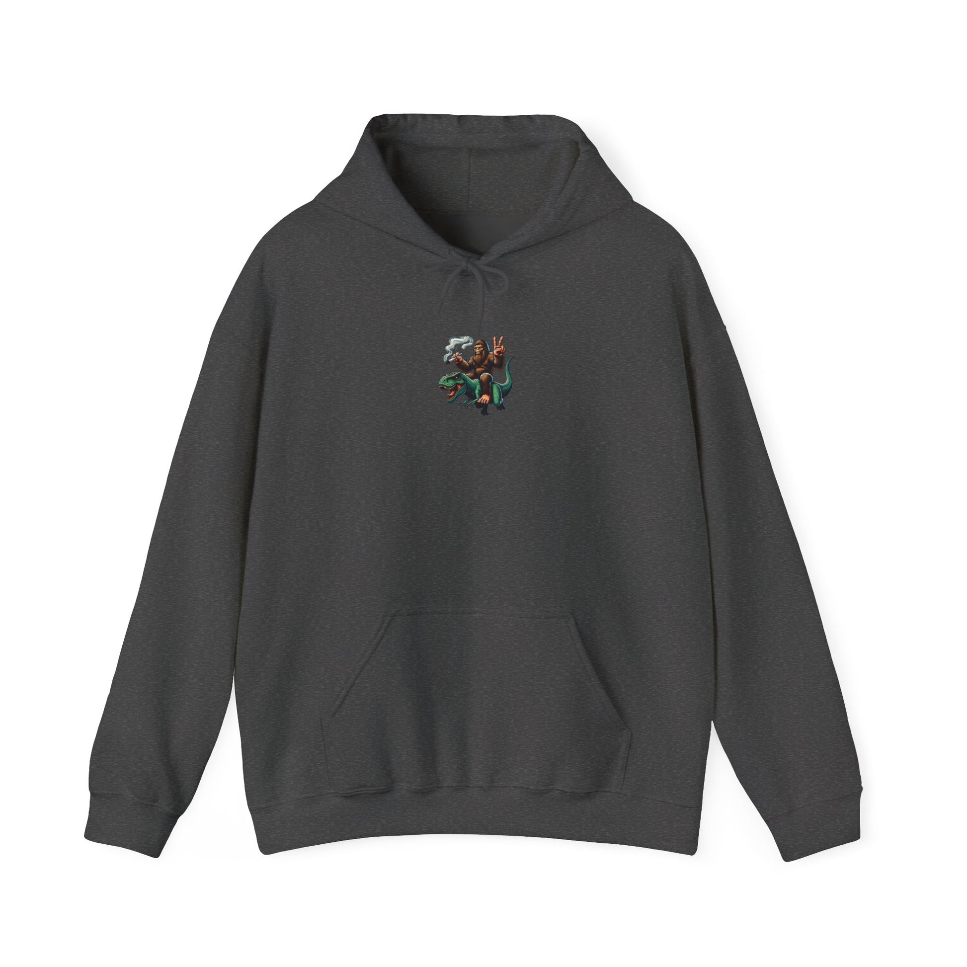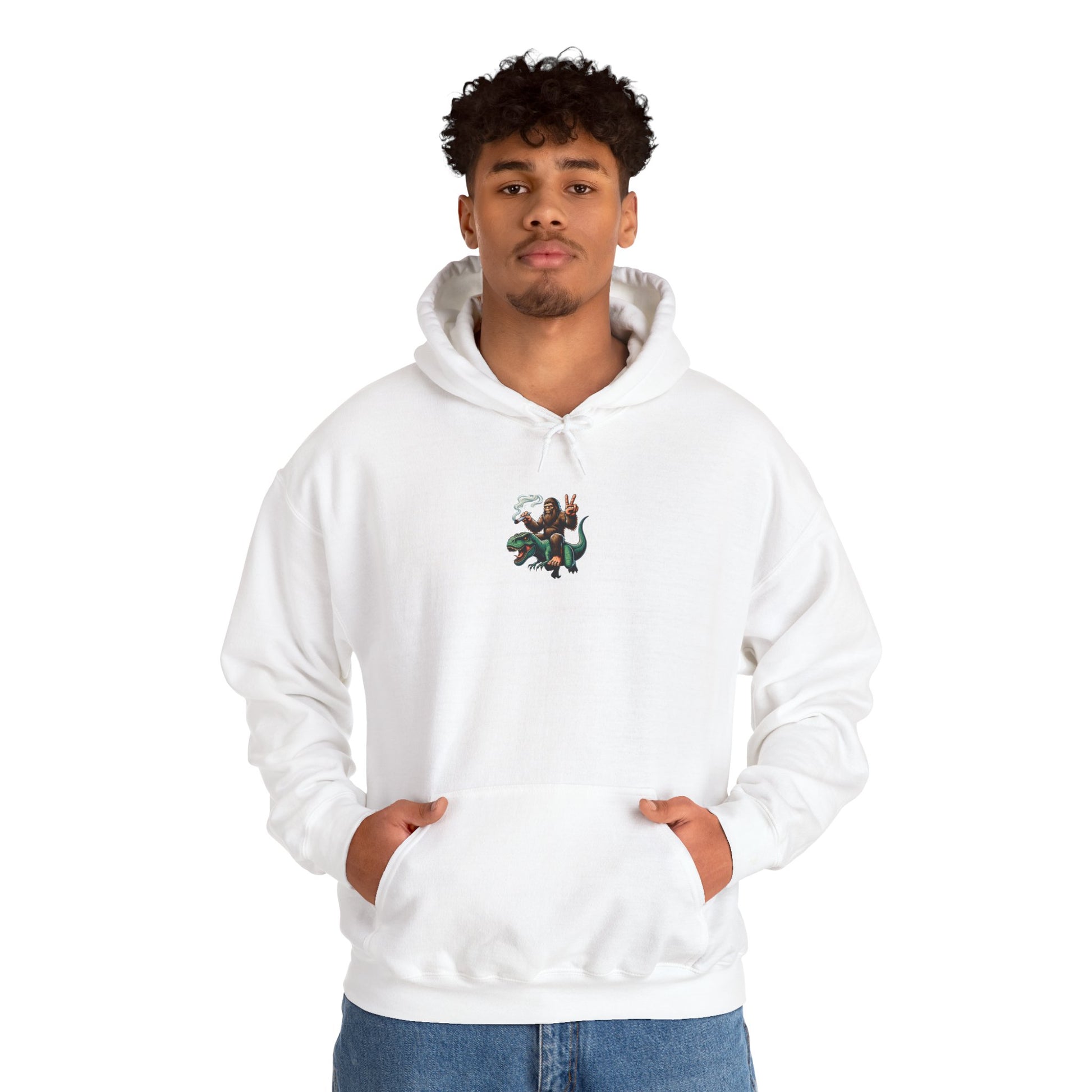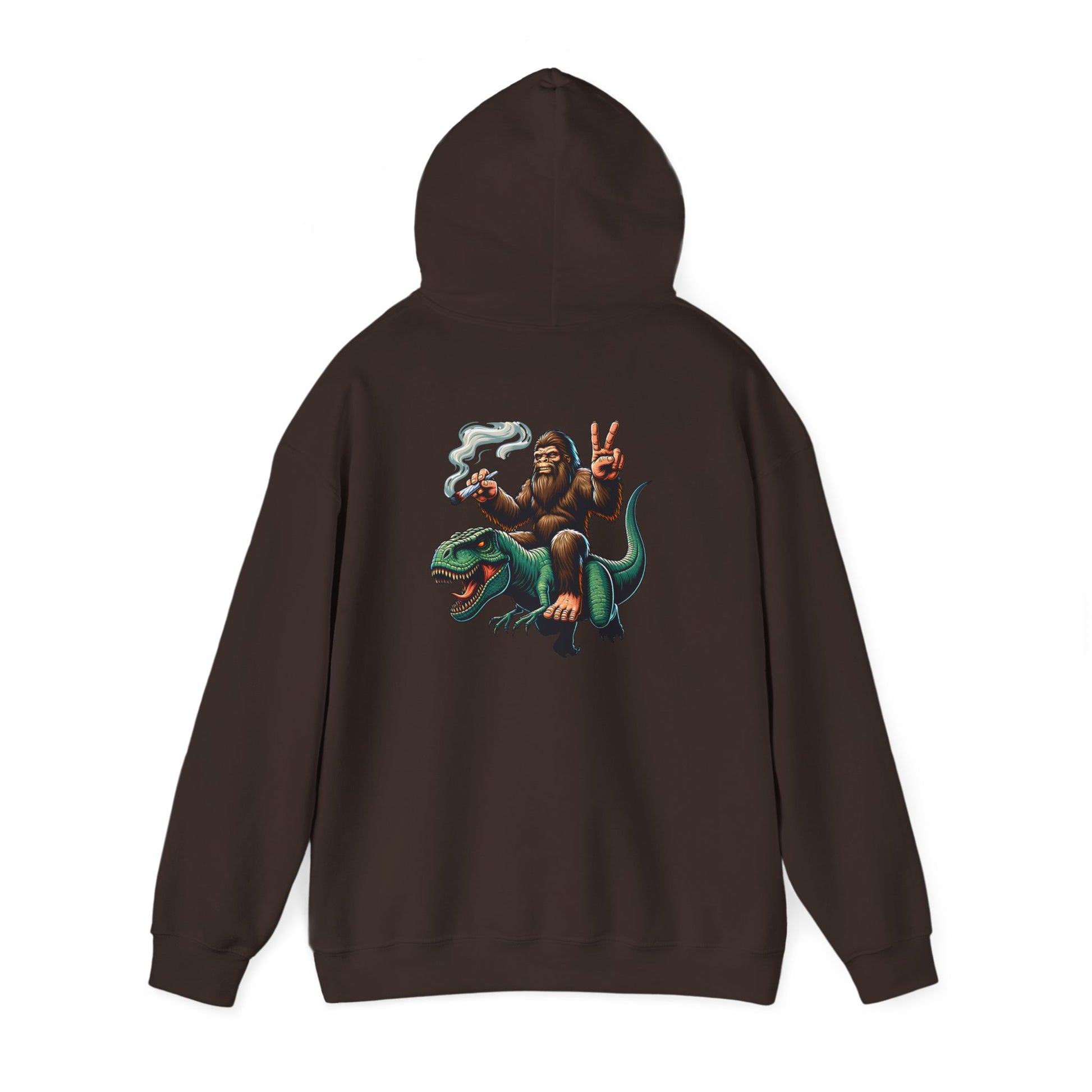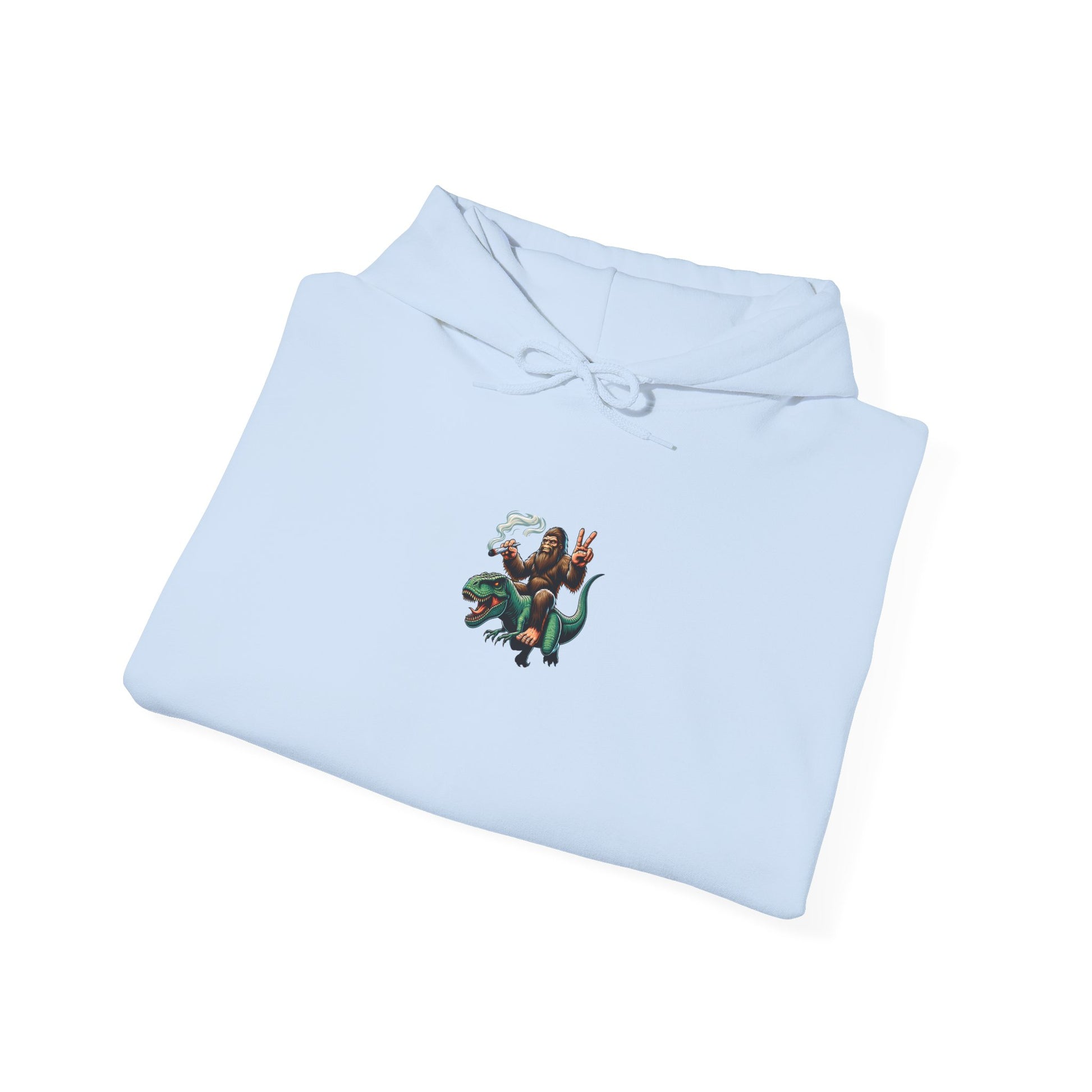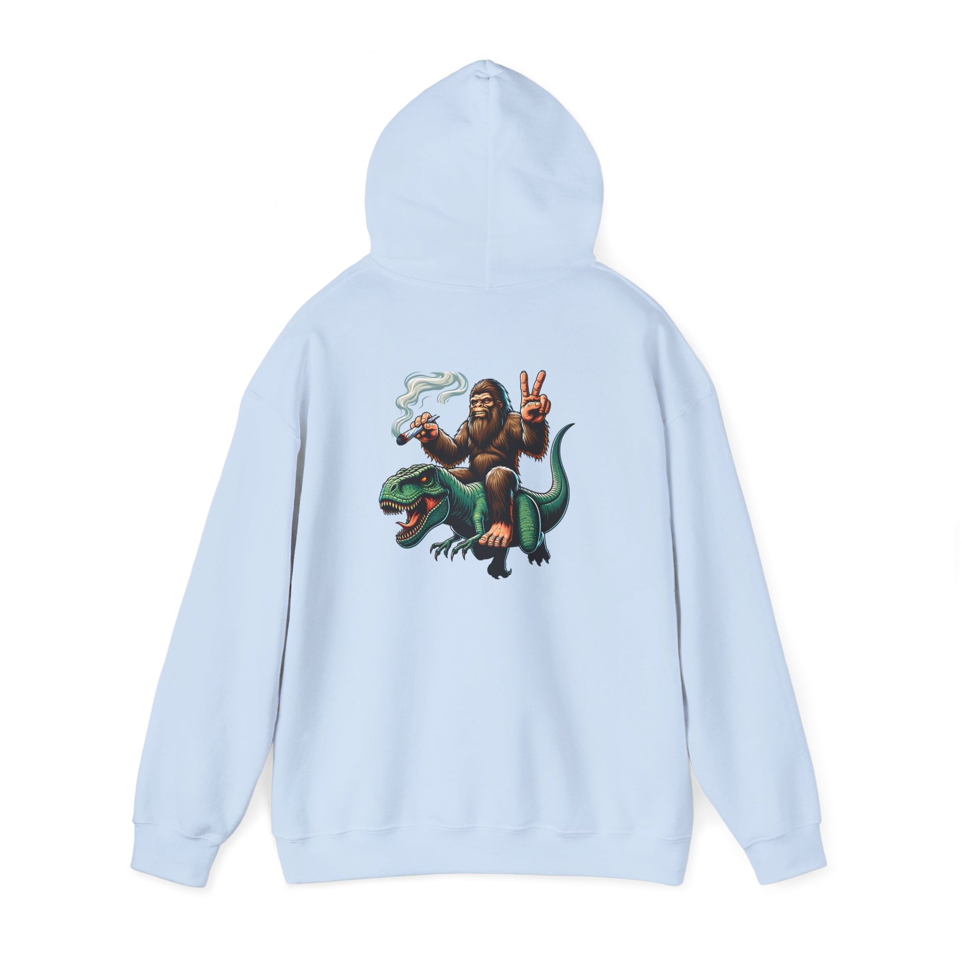 Bigfoot Riding Dinosaur Hoodie — Retro Smoking Sasquatch Graphic Sweatshirt